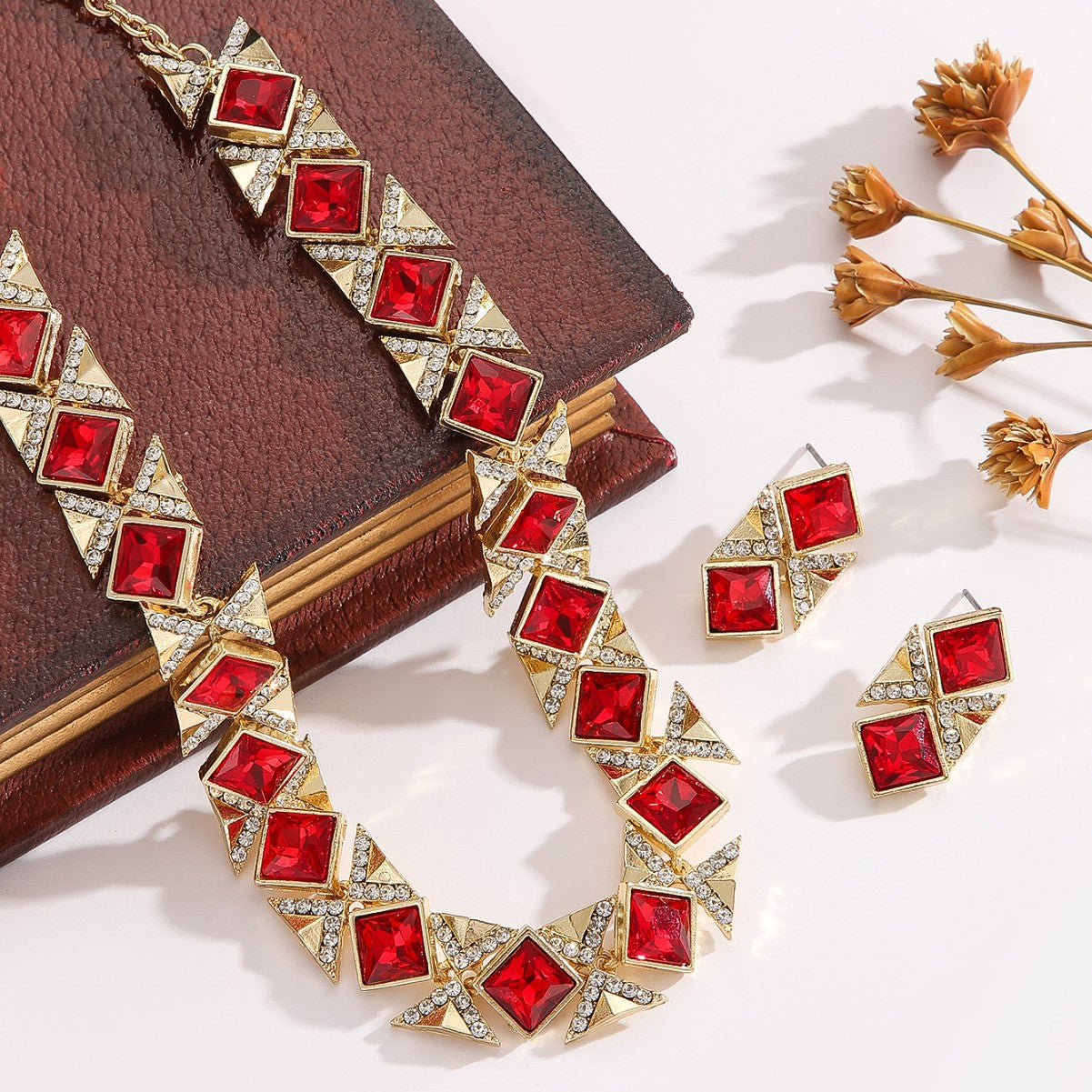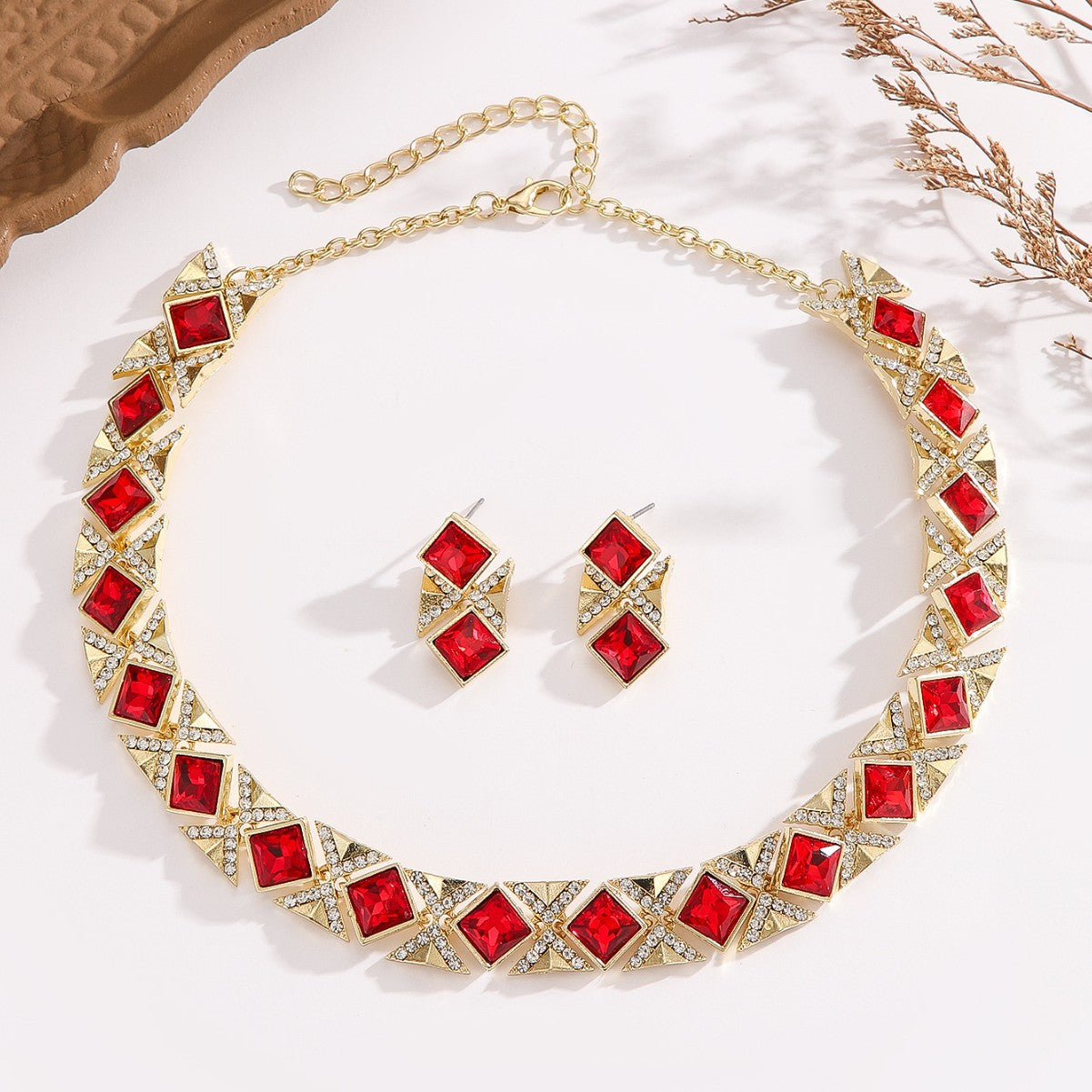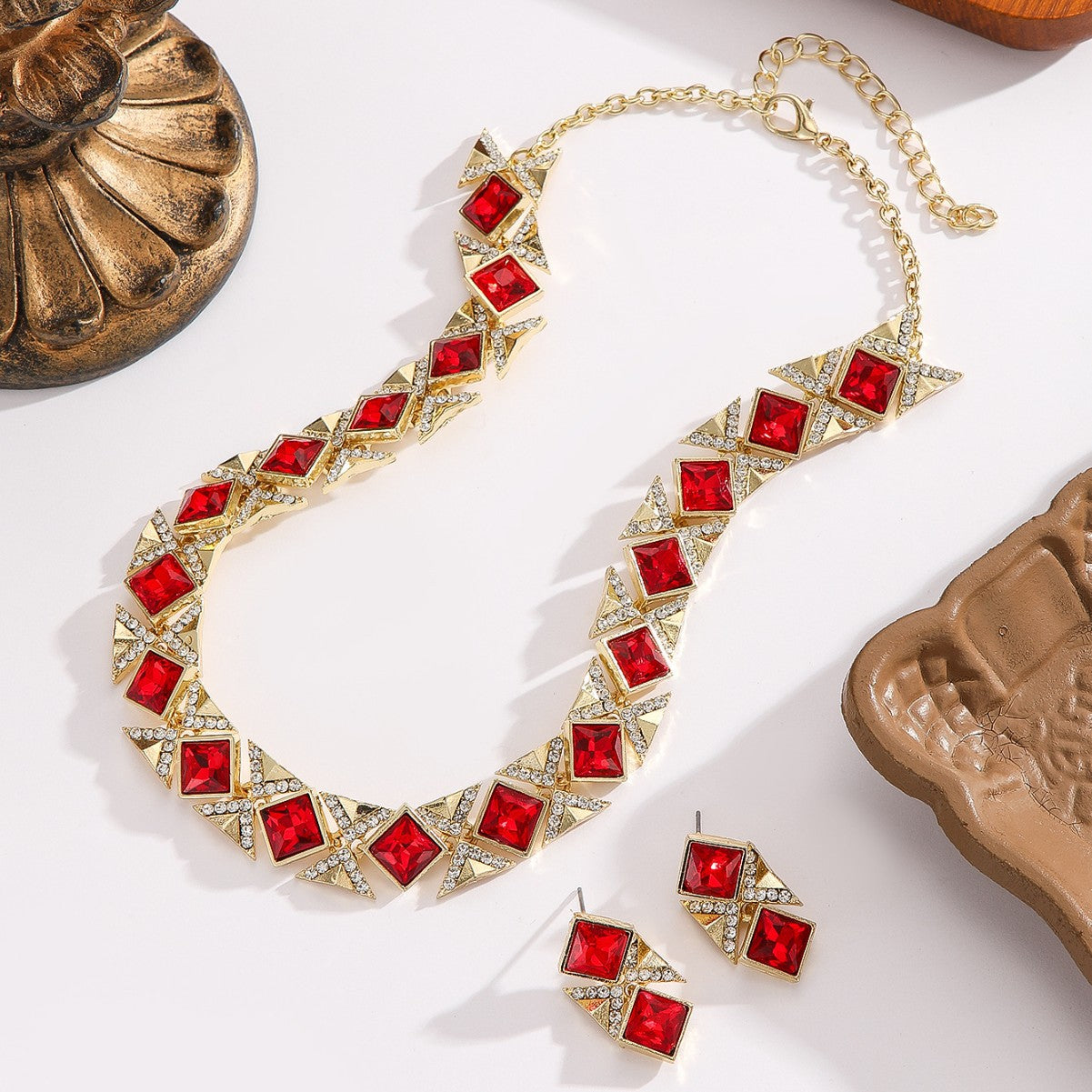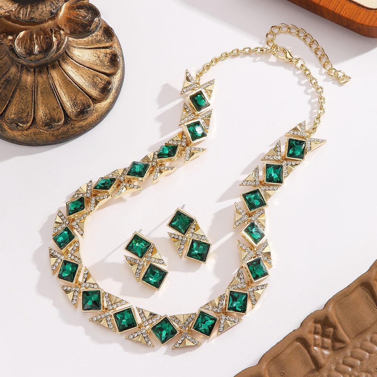 Sættet består af en smuk halskæde og matchende øreringe, skabt i et geometrisk design med firkantede krystaller indrammet i gyldne detaljer og funklende rhinsten. Resultatet er et sofistikeret, royalt udtryk, der fremhæver både stil og personlighed.